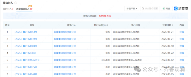 据企查查提供的信息显示,截至目前,银座集团股份有限公司共存在39条历史被执行人信息,被执行总金额527.82万元。其中,今年以来,该公司已累计被立案执行达10次之多,执行法院均为济南市中级人民法院。