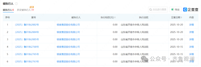 银座集团股份有限公司上述6条被执行人信息的立案日期分别为10月15日、10月20日,执行法院均为济南市中级人民法院。