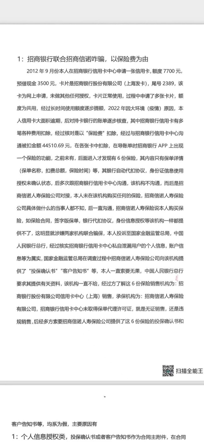 据举报人阐述:“我在2012年9月份在招商银行信用卡中心申请一张信用卡,额度7700元,预借现金3500元,2022年其因信用卡逾期,对持卡银行的账单逐步核查,其中招商银行信用卡有多笔‘保险费’扣除,导账单时发现招商银行APP上有6份保险,这些账单均在其不知情、未授权的情况下被扣除,累计金额达44510.69元。