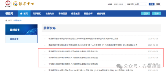 12月8日,平安银行发布公告称,该行2025年第120期个人不良贷款批量转让项目的债权金额为7.06亿元,其中,未偿本金总额2.84亿元,未偿利息总额4.17亿元,费用总额556.39万元。该资产包的借款类型为个人经营性贷款,加权平均逾期天数2975天,借款人所在地区为云南省。