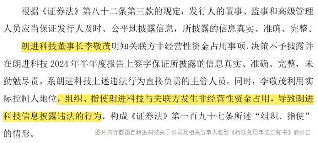 朗进科技因未及时披露一笔累计约4.15亿元的关联方非经营性资金占用情况,及定期报告存在重大遗漏等行为,被给予警告并处以250万元的罚款。实控人李敬茂因利用实控人地位,组织、指使公司与关联方发生非经营性资金占用,导致公司信披违法,被给予警告并处以440万元的罚款。另还有邱若龙等4名董监高被给予警告并处以总计230万元的罚款。