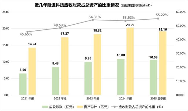 朗进科技起家于轨道交通车辆空调,业务高度依赖大客户,导致公司应收账款金额不断走高。同花顺iFinD数据显示,2023年公司的应收账款高达9.95亿元,占总资产的比重超过50%;2024年,这一比例达到53.62%;2025年前三季度,公司应收账款约10.58亿元,占总资产的比重增至55.22%。这意味着公司大部分营收仅是账面数字,未能转化为真实的现金回流。