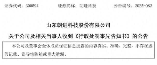 12月17日,山东朗进科技股份有限公司(以下简称“朗进科技”,300594.SZ)发布公告表示,公司及相关当事人收到山东证监局下发的《行政处罚事先告知书》。