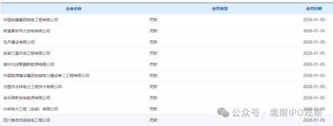 1月5日,华东能源监管局对包括中国电建集团核电工程有限公司在内的十二家企业采取罚款的行政处罚决定,合计罚款金额高达90万元。被处罚公司具体包括中国电建集团核电工程有限公司、郎溪景宇风力发电有限公司、泓天建设有限公司、安徽三星环保工程有限公司、宿州北控聚融新能源有限公司、中国能源建设集团安徽电力建设第二工程有限公司、宁国市永祥电力工程技术有限公司、安庆高新吉电能源有限公司、长峡电力工程(安徽)有限公司、四川省岳池送变电工程公司、长开建工集团有限公司、中国葛洲坝集团股份有限公司。