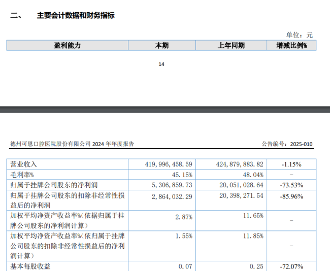 回溯可恩口腔最新披露的业绩情况,其2024年年度报告显示,报告期内公司实现营业收入4.20亿元,同比下降1.15%;归属于挂牌公司股东的净利润0.05亿元,同比下降73.53%。业务板块方面,口内牙周项目营收0.42亿元,同比增长1.81%,毛利率41.11%;修复项目营收0.91亿元,同比下降18.94%,毛利率45.21%;口外种植项目营收1.64亿元,同比增长16.77%,毛利率50.88%;儿牙正畸项目营收0.87亿元,同比下降8.54%,毛利率39.39%。