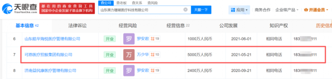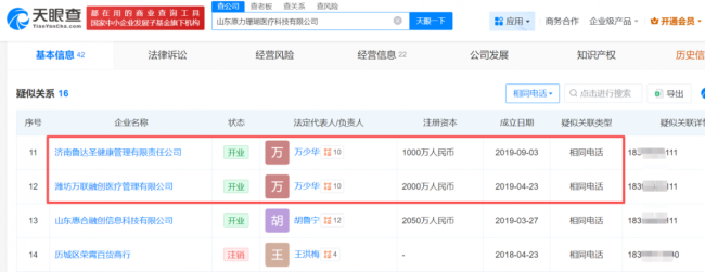记者注意到,据天眼查显示,好呀医疗全资控股的山东原力珊瑚医疗科技有限公司(下称“原力医疗”),其企业联系电话与可恩口腔实控人万少华旗下多家公司完全一致,涉及可恩医疗控股集团有限公司、济南鲁达圣健康管理有限责任公司、潍坊万联融创医疗管理有限公司、可恩口腔旗下济南可恩清田成长医疗投资管理合伙企业(有限合伙)四家由万少华担任法定代表人或实际控制的企业。