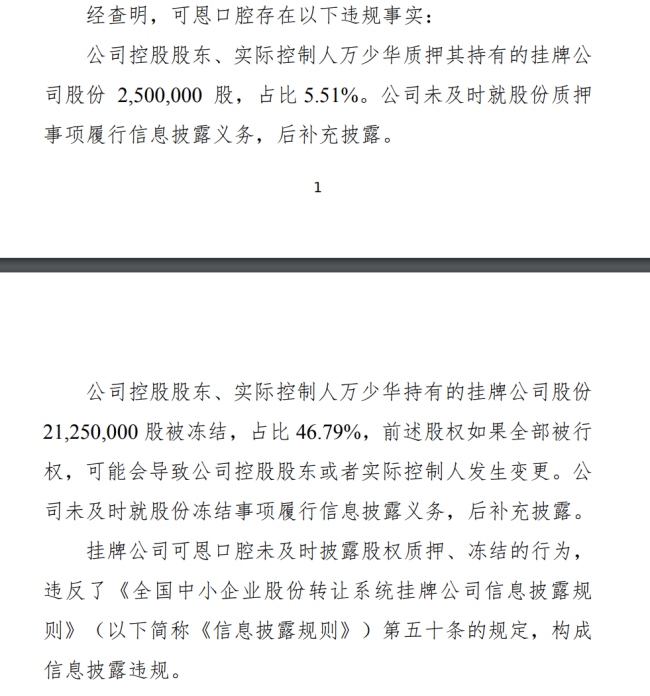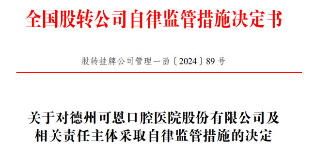 截至目前,已有媒体就供应商疑似与可恩口腔存在关联一事发送采访函,截至相关报道发布时,尚未收到公司回复。如该信息坐实,可恩口腔或涉嫌隐瞒关联方的违规操作。值得一提,可恩口腔在信息披露方面曾有过违规记录。2024年9月25日,全国股转公司发布自律监管措施决定书,指出可恩口腔控股股东、实际控制人万少华持有的250万股股份质押(占总股本5.51%)及2125万股股份冻结(占总股本46.79%)事项,公司未及时履行信息披露义务,直至后续才补充披露。该股权冻结事项若全部行权,可能导致公司控制权发生变更。最终,全国股转公司对可恩口腔、万少华及公司董事会秘书姬涛采取出具警示函的自律监管措施,并将违规行为记入证券期货市场诚信档案数据库。