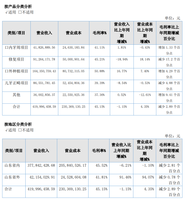区域布局上,可恩口腔目前仍以山东省内市场为核心,2024年省内市场营收3.78亿元,同比下降6.21%;省外市场营收0.42亿元,同比增长91.46%。