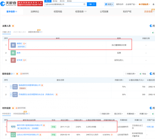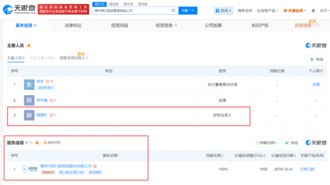 公开信息显示,山东允中投资管理有限公司持有可恩口腔2.82%的股份,其法定代表人郭艳红同时担任可恩口腔全资持股的德州德口医院管理有限公司财务负责人。