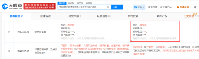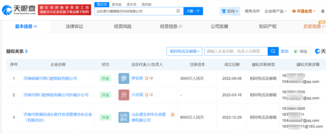 此外,原力医疗的联系电话还与可恩口腔控股60%的山东恩民企业管理有限公司一致,该公司财务负责人同样为郭艳红。原力医疗的邮箱信息还与济南承恩医疗科技有限公司、山东镭恩医疗科技有限公司、聊城伊姿娇美医疗科技有限公司三家企业重合,而这三家企业的法定代表人唐海军,同时担任可恩口腔多家门诊部的联络员,系公司员工。