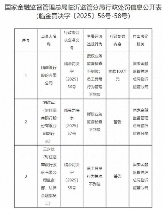 临商银行因授权业务监督检查不到位和员工异常行为管理不到位被罚款100万元;时任临商银行副行长刘建军因对授权业务监督检查不到位负有责任被警告,时任监察部、法律合规部员工王少波因对员工异常行为管理不到位被警告。