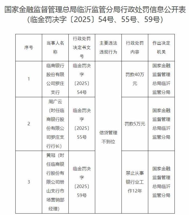 罗庄支行因“信贷管理不到位”被罚40万元。时任临商银行罗庄支行行长周广云被罚款5万元,时任临商银行册山支行市场营销部经理黄冠被禁业12年。