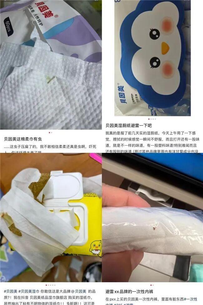 在个护产品线上,贝因美的问题同样突出。近期,记者接到消费者投诉称其在贝因美抖音旗舰店购买的贝因美湿巾有异物,她表示非常不解,第一这是大品牌“贝因美”,第二这是母婴产品。在小红书上,更多消费者投诉贝因美的棉柔巾、湿巾、一次性内裤中出现活虫。