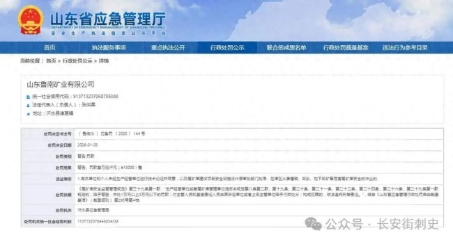 记者于山东省应急管理厅行政处罚公示栏了解到,1月5日,山东鲁南矿业有限公司(下称“鲁南矿业”)收到罚单,处罚机关为临沂沂水县应急管理局。