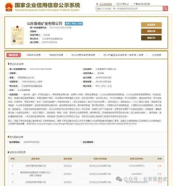 国家企业信用信息公示系统显示,山东鲁南矿业有限公司成立于2000年,注册资本7400万元人民币,法定代表人张洪果。股东及出资信息显示,大股东山东兴鲁投资有限公司持股35%,山东金岭铁矿有限公司与莱芜钢铁集团鲁南矿业有限公司工会职工持股会分别持股34%、31%。
