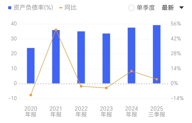 与盈利能力下降相对应的是公司资产负担的加重。2025年三季度,三安光电负债合计228.5亿元,资产负债率达39.21%,较2020年报的23.87%明显上升。