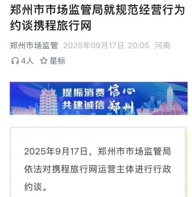 2025年9月17日,郑州市市场监管局对携程旅行网运营主体进行行政约谈。