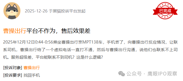 类似案例并非个例,2025年12月26日,有客户投诉称,乘坐车牌为京MPT138的曹操出行网约车时丢失手机,向平台反馈后,平台提供的司机联系方式无法接通,平台自身也表示无法联系到涉事司机。