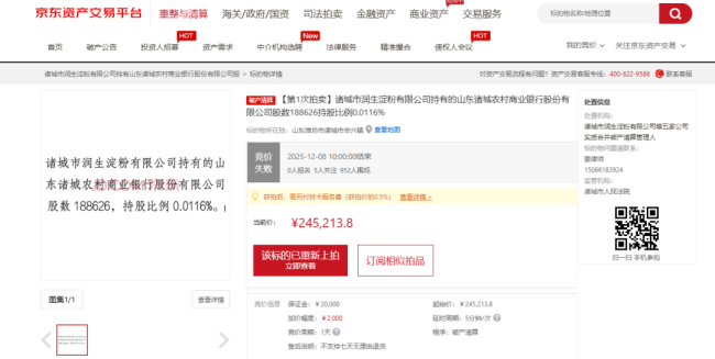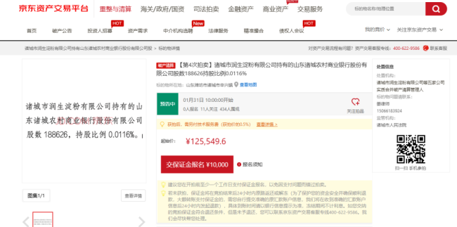 记者了解到,诸城农商银行还有一笔股权已被摆上拍卖台。据京东拍卖破产强清平台提供的信息显示,诸城农商银行18.86万股股权将于2026年1月31日公开拍卖,起始价为12.55万元,每股均价约0.666元。