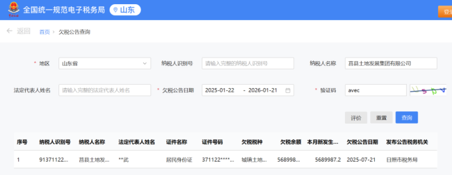 经全国统一规范电子税务局查询显示,截至2025年7月21日,莒县土发欠税余额约569万元,均为当月新发生欠税金额,欠税税种为城镇土地使用税。