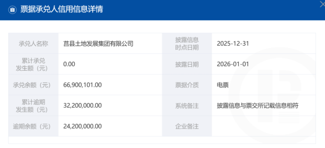 此外,莒县土发还面临着严重的票据逾期问题。据上海票据交易所网站显示,截至2025年12月31日,票据市场6个月内发生3次以上承兑人逾期的承兑人数量为4226家,莒县土发便名列其中,该公司持续逾期开始时间为2024年7月1日。截至2025年12月31日,莒县土发的票据承兑余额为6690万元,累计承兑发生额为0元;票据逾期金额为2420万元,累计逾期发生额为3220万元。