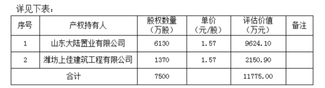 上述股权的所有人分别为山东大陆置业有限公司(简称“大陆置业”)、潍坊上佳建筑工程有限公司(简称“上佳建工”),持有的股权数量分别为6130万股、1370万股,由昌邑市人民法院依法处置。