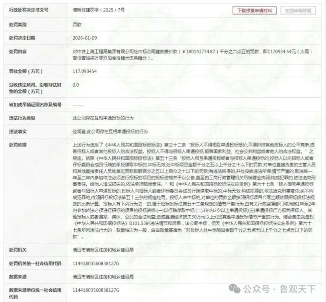 2026年1月9日,信用中国平台一则行政处罚公示引发行业震动:央企巨头中铁上海工程局集团有限公司,因在广东省清远市清新区某项目招投标中存在“互相串通投标”行为,被处以117.09万元罚款。这一处罚并非空穴来风——依据《中华人民共和国招标投标法》第三十二条规定,结合该项目18014.38万元的中标合同建安费,监管部门按千分之六点五的比例精准核算罚款金额,既符合法律规定的“千分之五以上千分之十以下”处罚区间,也让这家拥有1.5万名员工、年施工能力超千亿元的央企,因顶风违规陷入舆论漩涡。