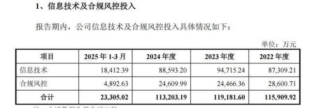 据中泰证券《向特定对象发行股票申请文件的审核问询函的回复》披露,2022~2024年度,该公司用于合规风控的投入分别为2.86亿元、2.45亿元、2.46亿元,三年合计总投入高达7.77亿元。