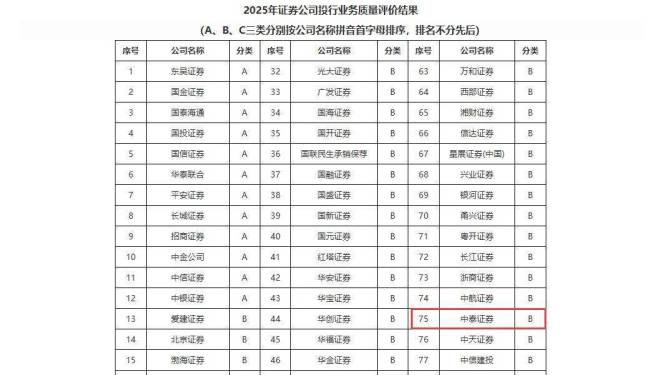 中国证券业协会上述执业质量评价结果披露,根据《证券公司投行业务质量评价办法(2025年修订)》,评价结果分为A、B、C三类,类别的划分主要反映参评证券公司股票保荐、债券承销、并购重组财务顾问和股转公司(北交所)等四类投行业务执业质量、内控制度建设与执行、服务高水平科技、支持上市公司并购重组及新股估值定价等情况的相对水平,同时适度兼顾评价期后至评价结果发布前部分证券公司重大违规事项的影响。