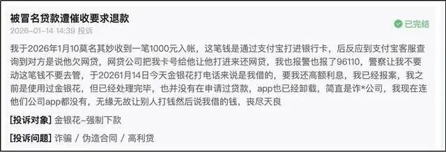 有消费者在收到陌生人的支付宝转账1000元后,通过支付宝客服联系到了转账方,“对方是说他欠网贷,网贷公司把我卡号给他让他打进来还网贷。”几天后“金银花”平台的工作人员联系该消费者要求还款,其随即报警,“警方让我不要动这笔钱,不要去管。”