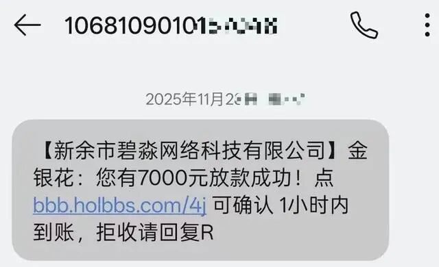 “金银花:您有7000元放款成功,点击链接可确认,1小时到账。”不少消费者莫名其妙地背上贷款,往往是从点击了这样一条短信中的网页链接开始的。