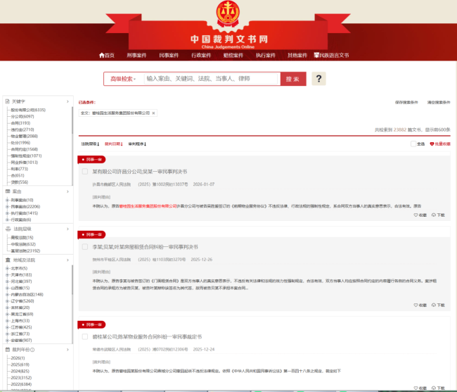 此外,碧桂园生活服务集团近年来官司“缠身”,涉及多起司法案件,且以民事案件为主。中国裁判文书网显示,截至2026年1月26日,碧桂园生活服务集团有23882篇文书,案由包括物业服务合同纠纷、服务合同纠纷、财产损害赔偿纠纷、健康权纠纷、其他民事等。