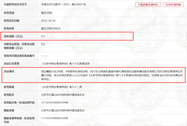 2025年11月2日,北京市石景山区住房和城市建设委员会发布《行政处罚决定书》显示,2025年10月24日,因西山麓园小区2号楼、4号楼存在堆放杂物、自行车占用消防通道的情况,碧桂园生活服务集团股份有限公司作为物业管理单位未履行劝阻、制止和报告职责,以上行为违反《北京市物业管理条例》第六十五条第四项的相关规定。最终,碧桂园生活服务集团被警告,并处以5000元的罚款。