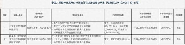 1月30日,中国人民银行北京市分行发布行政处罚决定,北京新浪支付科技有限公司(下称“新浪支付”)因“为不符合代收场景的商户提供代收服务”等四项违法行为被警告,并罚没合计约184.47万元。该公司相关责任人因两项违法行为也被警告,并处罚款10万元。