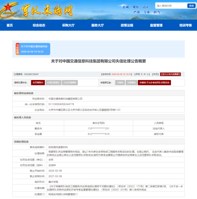 根据军队供应商管理相关规定,自2026年2月8日起,禁止中国交通信息科技集团有限公司1年内参加全军物资工程服务采购活动的处理。