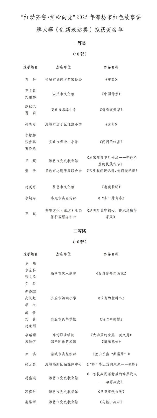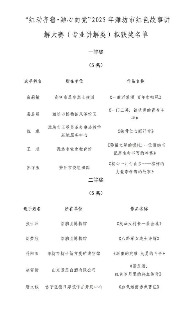 2025年7月23日至25日,“红动齐鲁·潍心向党”2025年潍坊红色故事讲解大赛在潍坊市老年大学成功举办。本次大赛由潍坊市委宣传部等6部门联合举办,设有志愿讲解类、专业讲解类和创新表达类三个类别。鉴于各地各单位积极发动参加比赛,参赛队伍数量较多、内容丰富,收效甚好,为扩大激励效果,为下届做好统筹,根据前期工作安排和参赛选手数量,拟设置以下奖项:志愿讲解类一等奖15名、二等奖20名、优秀奖20名;专业讲解类一等奖5名:二等奖5名;创新表达类一等奖10部、二等奖10部;大赛优秀组织奖4个。