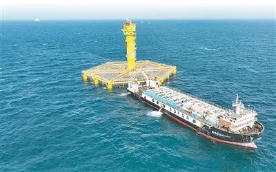 岚山区网箱养殖三文鱼迎来收获期,养殖工船正准备收鱼。崔恒摄(人民视觉)