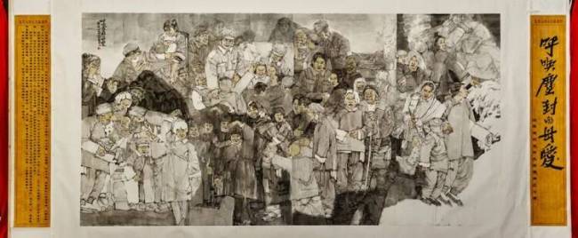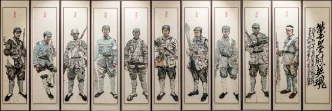 其中,《呼唤尘封的母爱》以胶东红色乳娘为主题,将60多个真实人物、10多个真实故事穿插在一幅国画作品中。巨幅国画《笔墨慰英魂》则生动再现了马石山十勇士的光辉形象。83年前,马石山十勇士放弃突围机会,“四进三出”包围圈,用生命换回上千名群众的安全;如今,却无人能知道他们的模样。为弥补这个遗憾,山东省美术家协会常务副主席兼秘书长张宜、山东艺术学院副教授华杰、山东传媒职业学院副教授何怀雨三位画家决定以画为碑,用笔墨寻找他们的身影,最终完成这幅作品。