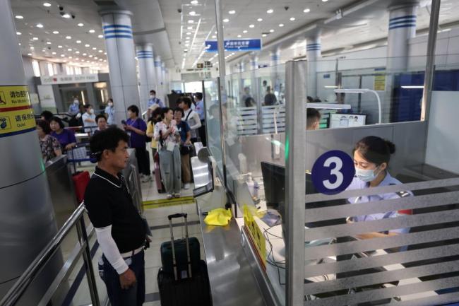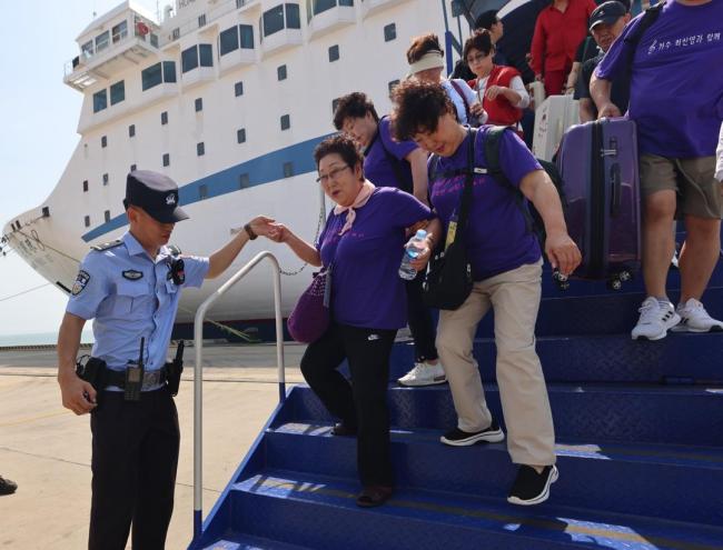 图为:10月3日上午,在荣成石岛,108名韩国游客从石岛口岸入境,开启在威海的数日旅程。10月4日、6日,还各有一个超过500人的大型韩国旅行团从石岛口岸入境。(石岛边检站供图)