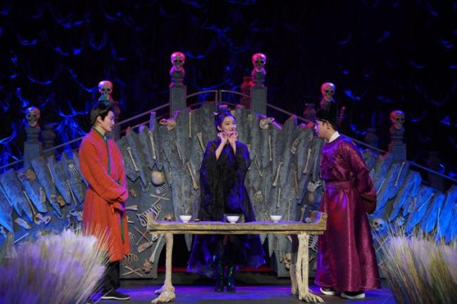 迈入剧场,丹青朱砂的中式布景在灯光的配合下,将氛围感拉到极致。该剧改编自蒲松龄的《聊斋志异·三生篇》,讲述了地府之中一起因科举不公导致的命案,既将郁郁不得志的蒲松龄科举之路融入故事,也有对当下职场文化的幽默表达。