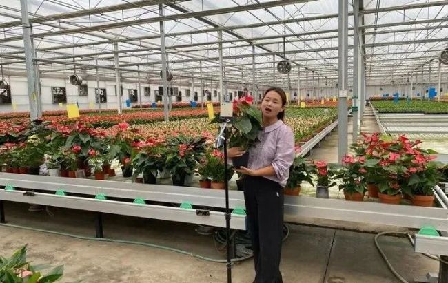 在乡村绿洲(山东)农业科技股份有限公司的花卉温室里,花农们正对着手机镜头展示红掌和蝴蝶兰。“商河花卉的花期比云南的还长,产品好,是我们最大的优势。”运营团队负责人庄云关介绍,行情好时每月线上销售额达6万余元,带动线下交易30万元。