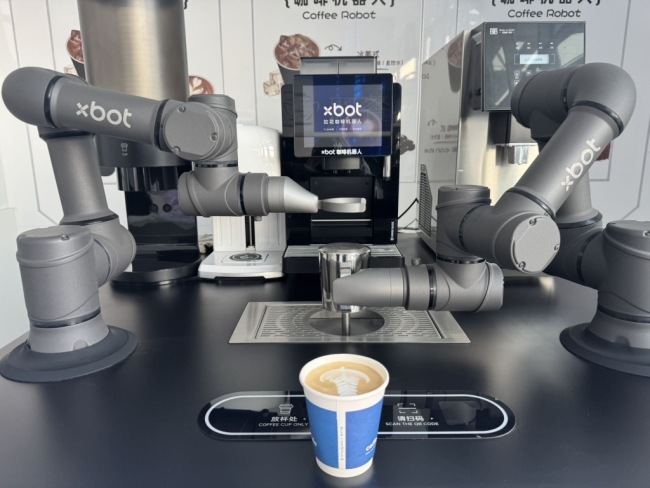 继续前行,一处咖啡角吸引了众人目光。这里是全自动机器人咖啡站。只见两只机械臂默契配合:一只取杯、移向咖啡出口,另一只同步接取奶泡,并轻晃奶泡杯,动作干净利落。待奶泡就绪,左臂将咖啡杯平稳前送对准奶泡杯,右臂则熟练地进行拉花,勾勒出一个精致的小麦图案。随后,左臂将成品咖啡递至顾客手中,右臂则将余奶倒弃并启动自动清洗。全程行云流水,一气呵成。