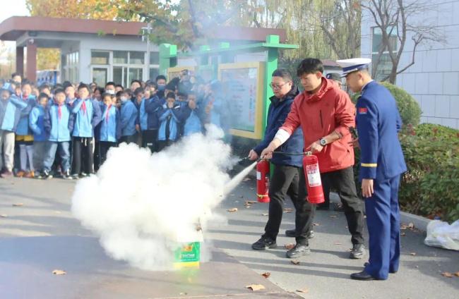 消防宣传人员重点演示了干粉灭火器“提、拔、握、压”的使用步骤,以及湿毛巾捂住口鼻、弯腰低姿逃生的正确方法。随后,在消防救援人员的指导下,师生代表依次上手操作灭火器,亲身体验“灭火”过程,通过沉浸式学习科学逃生技巧,切实将理论知识转化为实际能力。