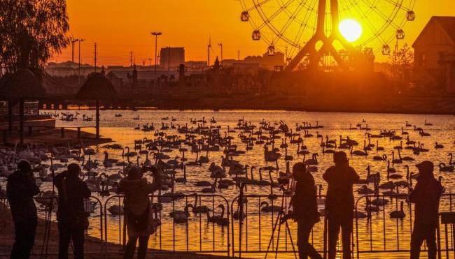 11月26日,威海荣成市那香海天鹅湖迎来越冬大天鹅栖息高峰,千余只大天鹅迎着日出舒展羽翼,在晨光浸染的湖面上构成一幅人与自然和谐共生的生态画卷。