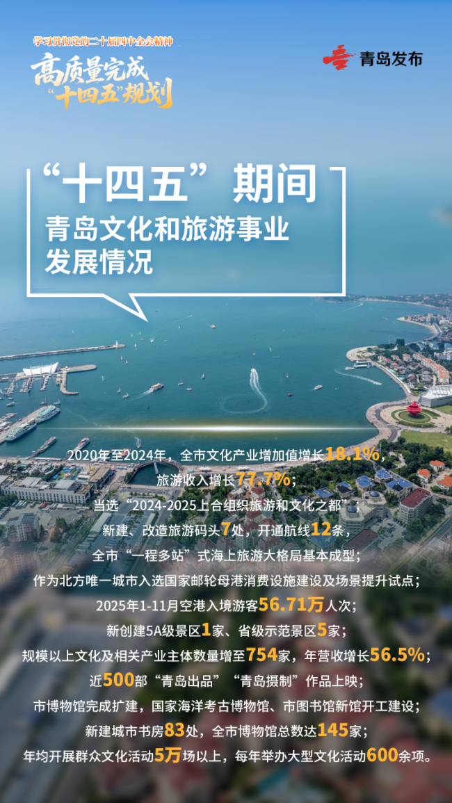 面向“十五五”,青岛市将持续深入贯彻落实党的二十届四中全会精神,把造福人民作为根本价值取向,锚定教育强市、人才强市、国际滨海旅游度假目的地等目标,认真谋划推进好各项工作,始终重视抓好教育、人力资源社会保障、文化、旅游等民生事业,不断满足人民对美好生活的向往。