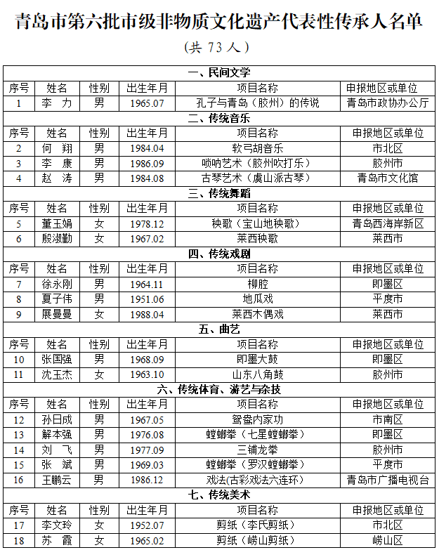 按照《青岛市文化和旅游局关于做好第六批市级非物质文化遗产代表性传承人申报推荐工作的通知》(青文旅非遗字〔2025〕1号)要求,经各区(市)推荐申报、专家评审委员会评审、社会公示等环节,认定了第六批青岛市级非物质文化遗产代表性传承人73人,现予以公布。