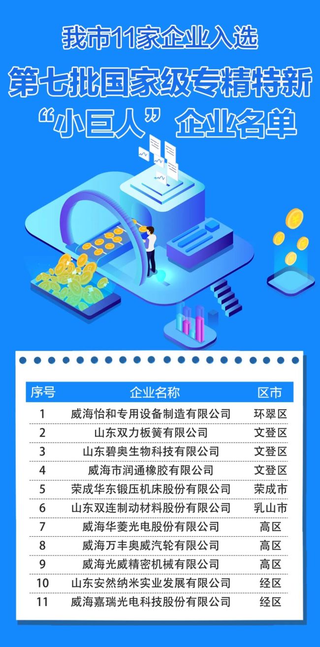 近日,工业和信息化部公布第七批国家级专精特新“小巨人”企业名单,威海市华东锻压、万丰奥威等11家企业成功入选。截至目前威海市已累计培育国家级专精特新“小巨人”企业65家,占规上工业企业比重达4.6%,位居全省前列。