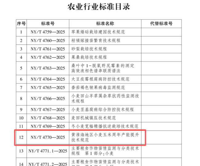 2025年12月09日,农业农村部颁布364项中国农业行业标准。其中,德州市提报的《黄淮海地区小麦玉米周年产能提升技术规范》成功获批,将于2026年5月1日起实施。