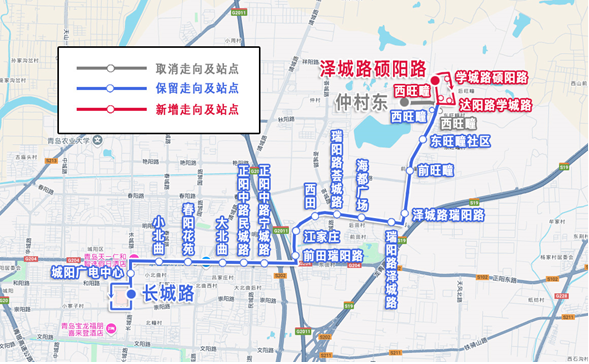 往泽城路硕阳路方向:自“长城路”始发站,沿原线路至“西旺疃”站,沿泽城路至“泽城路硕阳路”站止,调整后线路走向为:长城路、正阳中路、瑞阳路、泽城路。