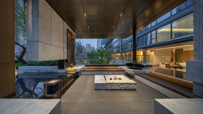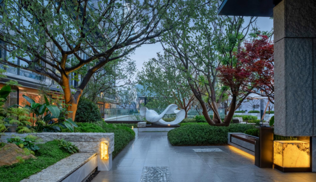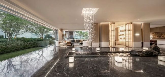 约80米的三进归家长廊,启程一段心灵逐渐安放的旅程。一进“鎏光华堂”,以约9米挑高穹顶大堂与定制艺术雕塑,营造恢宏的迎宾气度;二进“拾光艺廊”,通过约18米隐奢光影连廊,实现从开放到私密的空间过渡;三进“浮光水庭”,以特选百年榉树与水景平台相映,形成静谧的庭院核心。这三重递进的空间节奏,赋予归家路径以艺术体验与情绪共鸣。